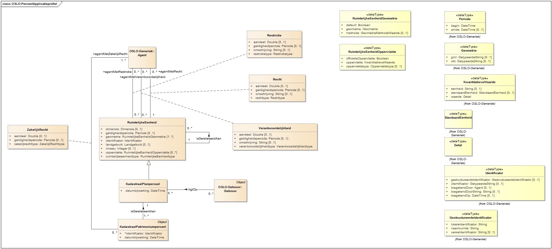 In Vlaanderen wordt er door Informatie Vlaanderen en de Algemene Administratie voor Patrimoniumdocumentatie (AAPD) gewerkt aan één authentieke bron voor perceelsinformatie (uniek percelenplan). Binnen deze bron wordt elk privaat/eigendoms- perceel in Vlaanderen uniek geïdentificeerd en gekenmerkt door een geometrische voorstelling, (bruikbaar in een schaalbereik van 1/250 – 1/5000 OF in lijn met de aanbevelingen in de INSPIRE dataspecificaties voor kadastrale percelen (link)). De AAPD vervult de rol van beheerder van deze bron en voert deze uit volgens de principes overeengekomen met Informatie Vlaanderen en gebruikers van perceelsinformatie in Vlaanderen. De gegevens in deze bron worden verspreid onder verschillende productvormen (Administratief perceel (ADP) in de Basiskaart Vlaanderen (GRB), kadastrale percelen (CaPa) in het kadastraal perceelsplan (CADGIS), …). Via dit initiatief wensen overheden in Vlaanderen in samenwerking met de Algemene Administratie voor Patrimoniumdocumentatie (AAPD) perceelsinformatie in Vlaanderen semantisch te modelleren. De resulterende standaard ‘percelen’ moet vlot kunnen worden hergebruikt door alle belanghebbenden. Dit is het applicatieprofiel van het OSLO traject Perceel en beschrijft de relaties tussen de verschillende entiteiten.